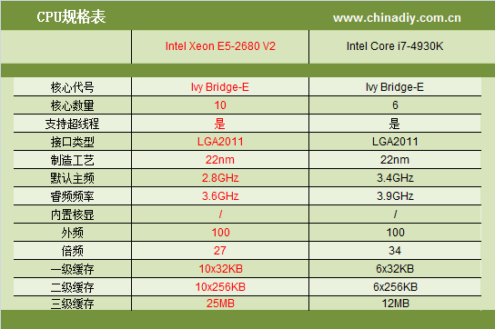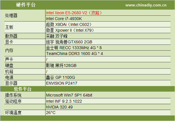 这套双CPU平台采用刚发布的两颗E5-2680 V2处理器组成,与旧版E5-2680相比它的主要改变就是由Sandy Bridge-E升级成Ivy Bridge-E,核心方面也从原来的8核16线材顺势升级至10核20线程,因此理论上处理性能也得到了明显提高。而本次测试的对手就选择了同样是Ivy Bridge-E核心的i7-4930K,两个平台主要是核心、线材数量与主频上的区别,用于对比双路E5-2680 V2平台与普通家用顶级平台在性能上的差异。