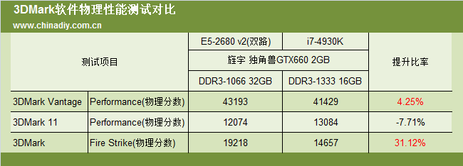 由于3DMark Vantage和3DMark 11两款软件对双路平台和新CPU还不能完美支持,所以从成绩中可以看到双路E5-2680 V2平台和i7-4930K平台分数较为接近。不过最新的3DMark软件已经改善了兼容性,因此双路E5-2680 V2平台最终得分大幅领先对手约31%。