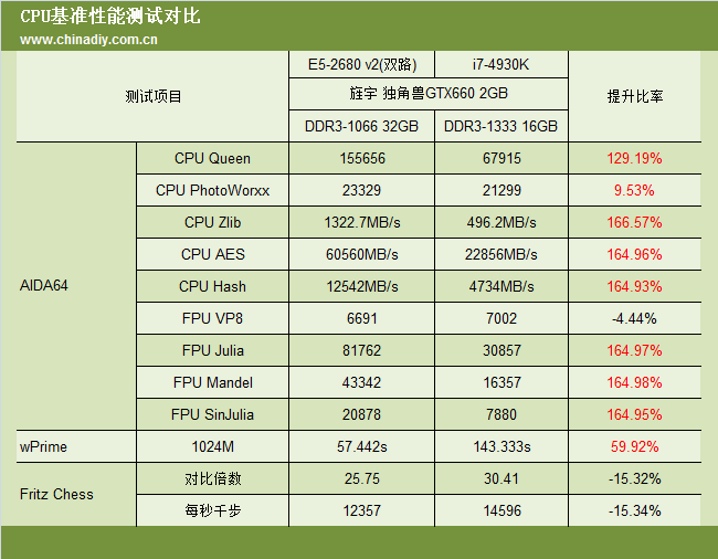 在性能评测中双路E5-2680 V2平台展示出了强劲的处理性能,其中多个处理能力测试项目中都拥有不错的成绩,特别是AIDA64测试中的6个项目对比i7-4930K均达到了160%以上的提升比率,由此可见20核40线程平台在特定项目中确实拥有比家用顶级平台不可比拟的优势,能给服务器和行业用主机带来更高的性能。