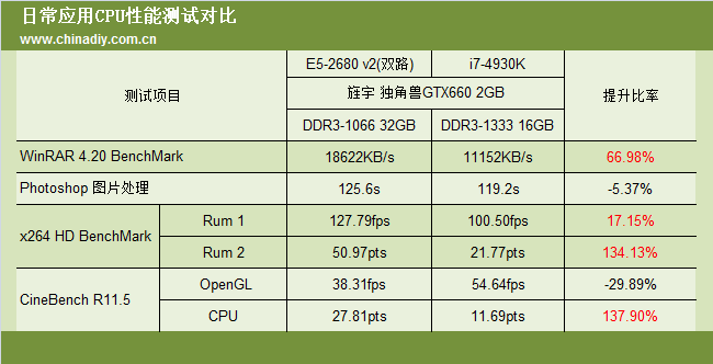 在日常应用处理性能测试上,双路E5-2680 V2平台也有不错成绩。无论是解压性能、视频转码能力和CPU绘制渲染部分都显示出了多线程平台的处理能力优势,但有可能是由于兼容性或者测试项目安排的原因,双路E5-2680 V2平台的Photoshop批处理和测试显卡图形性能的CineBench R11.5 OpenGL项目成绩都不如i7-4930K平台。