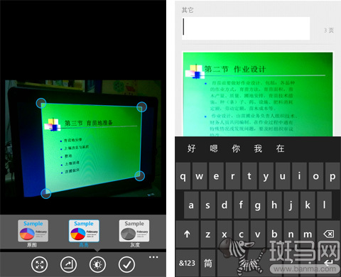 这款应用可以对图片中的内容部分自动剪裁,并进行智能纠偏。即便你是在一个偏角很大的位置拍摄了PPT或者白板上的内容,应用也能自动将指定的内容还原为如同正面拍摄一般。