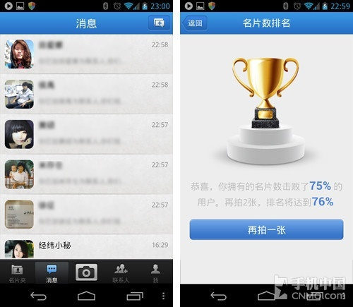 名片一直都是一个难办的事儿,虽然在智能手机上有名片扫描软件,但是扫描名片的识别率和电子名片的管理也很让人烦,所以我们需要一个可以跟通讯录真正联系在一起的手机软件,一次扫名片,就可以直接拨打电话,同时还有最详实的名片信息,而这就是经纬名片通 。