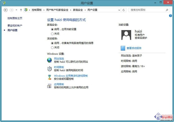 从下图见到新添加的儿童账户,名称为“haizi”,家长可以点击账户图标进一步设置该账户的各种权限,包括管理拥有该账户的儿童访问网站的范围,使用电脑的时间,涉猎游戏和应用的品种等等。