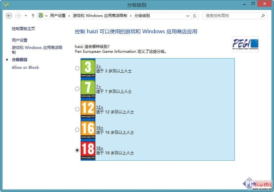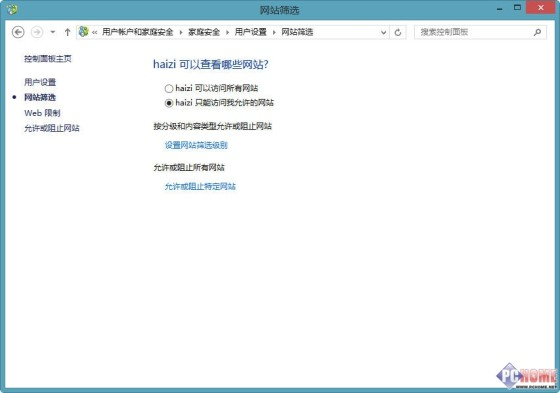 下图就是Win8.1儿童账户的权限设置界面,家长们可以利用系统管理员账户的高级权限,在此界面上管理儿童账户的系统使用权限。