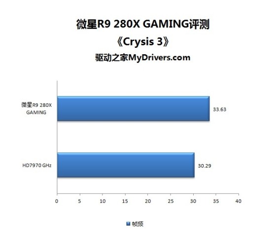 作为新一代显卡杀手,《Crysis 3》的表现没有让我们失望,即便是R9 280X也仅取得了33.63帧每秒的成绩,作为对比,HD7970 GHz仅取得了30.29帧每秒,刚刚达到能玩。