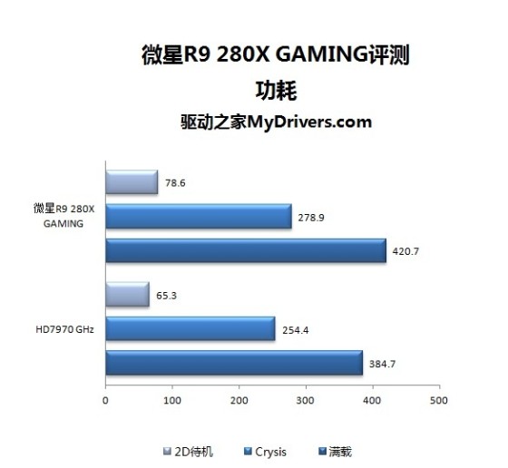 对于高端显卡来说,非公版都会比公版有着更优秀的性能,但随之来带来更大的功耗。微星R9 280X的待机功耗要比HD7970 GHz高出13W,游戏功耗高出25W,而到了满载功耗中则将近40W。