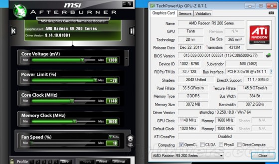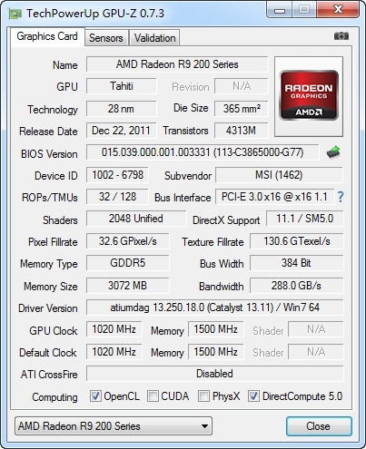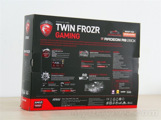 从其核心频率为基础850MHz、加速1000MHz可以看出, R9 280X的定位介于HD 7970和HD 7970 GHz之间。而我们今天评测的这款显卡是微星出品的非公版R9 280X GAMING 3G,其默认主频达到1000/1050MHz,参数全面超越HD 7970 GHz 。