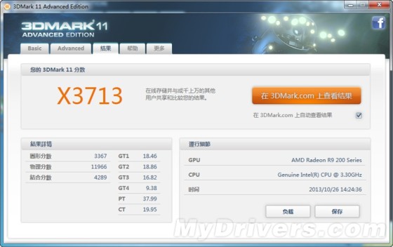 相比默认频率,主频提升了37.3%,显存提升了6.67%。最终运行3Dmark 11的X模式得分为3713,相比未超频之前的3397分,性能提升了9.3%。