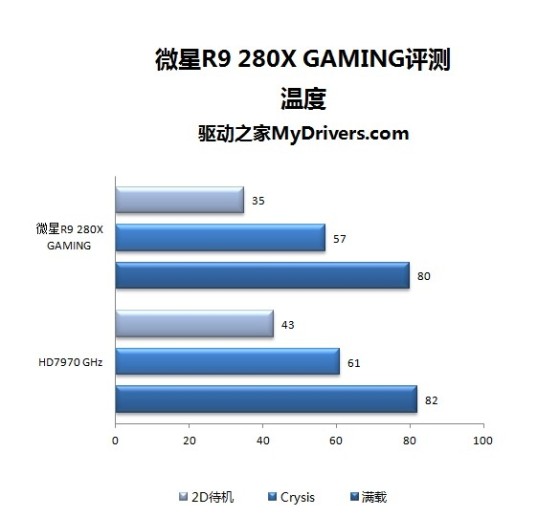 微星R9 280X GAMING作为一款非公版显卡,采用了双风扇设计,在散热效果上有不俗的表现。从测试结果来看,微星R9 280X的待机温度要比HD7970低出8度,游戏温度控制的不是很出色,仅低4度,满载温度也仅仅低2度。