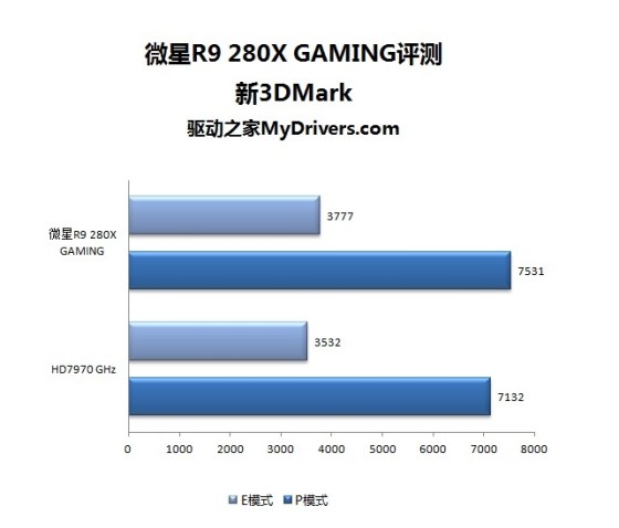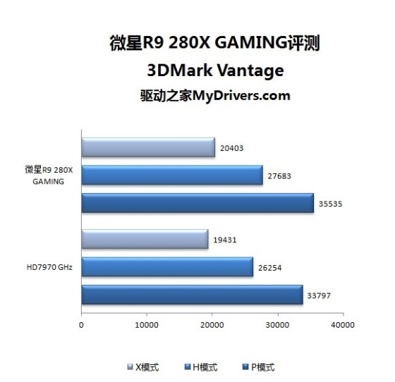 3DMark 11测试中,微星R9 280X在P模式和X模式均领先HD7970 GHz 9%左右。