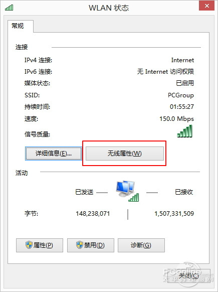 2.在“WLAN状态”窗口中找到“无线属性”;