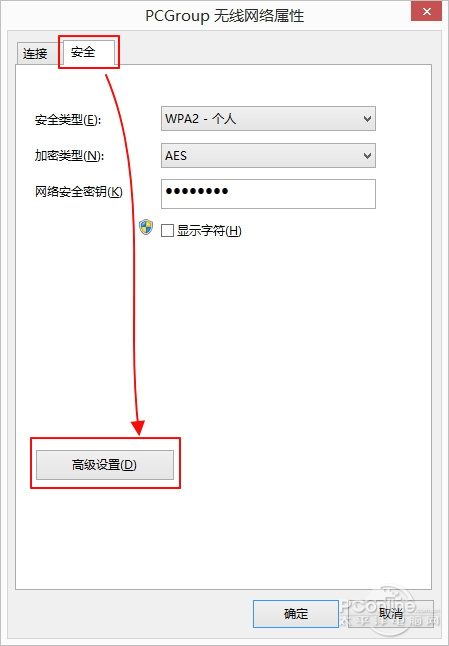 3.进入“无线网络属性”窗口,切换到“安全”页面,点击“高级设置”;