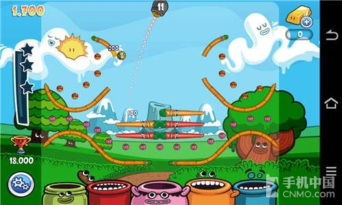 本作的玩法非常简单,几乎不用玩家动脑筋,只要选择好目标角度开炮,让炮弹在各种障碍物之间弹来弹去最终落到下面的坛子里就要可以了。当然,简单归简单,游戏还是有判定规则的,也就是说,每关都有额定的分数,玩家必须要达到某个分数值才能过关。