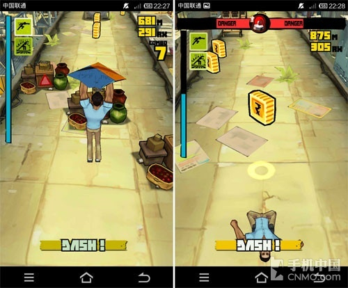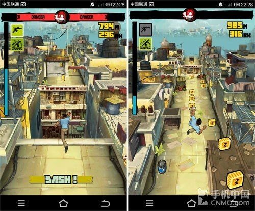 关于两段跳与强力冲刺的操作方法很简单,只要玩家向上滑动两次屏幕即可实现两段跳跃,而启动强力冲刺的方式则需要玩家在跑酷过程中攒够一定的力量值才可以,画面左侧的蓝色条状栏就是力量槽,攒满之后点击画面正下方的“MASH”即可。