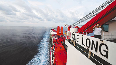 “雪龙”号穿越赤道 人民网-人民日报 2013.11.1512:05 关注 11月14日,中国第三十次南极科学考察队乘坐“雪龙”号穿过赤道,从北半球进入南半球。由于赤道海面水平气压梯度小,不易形成大风,被称为“赤道无风带”,海面风平浪静。图为“雪龙”号航行在赤道无风带海域。新华社记者 张建松摄