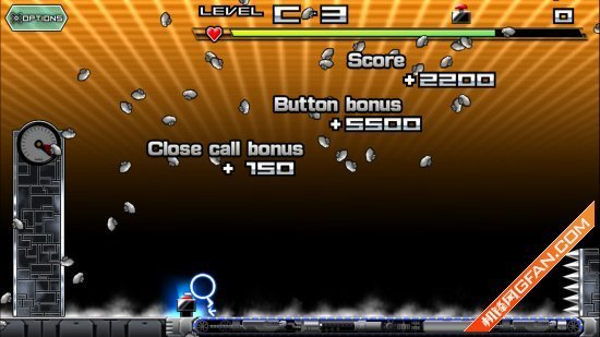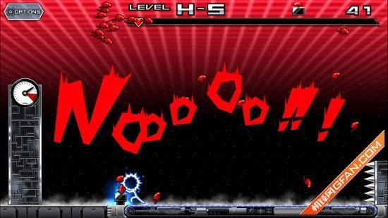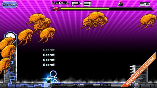 火柴人先生虽然看起来好像操作很简单,可是实际的上手你就会发现并不是你想的那样,因为在跑动的途中,天上会掉下众多的虱子,没错就是虱子,我们既要想办法多按两下按钮,又要躲避空中的虱子,而且,如果你让这些虱子掉在火柴人的身上,屏幕最上方的血条就会不断减少,直到你死掉为止。但是如果你一为的后退,又会撞上身后的尖刺,所以说难度之大可想而知。