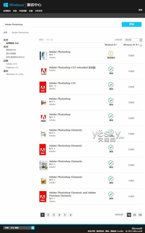 另外,微软为Windows 8.1系统提供了软硬件兼容中心(Compatibility Center), 用户访问这个页面可以轻松获悉Windows 8.1的兼容信息以及该系统兼容的设备驱动、软件升级以及下载等。搜索栏中键入我们需要查询的硬件品牌与型号,我们就可以了解该产品是否与Windows 8.1兼容,同时还能看到相关的社团评分以及对应软件下载地址。如果查询对象是软件,可以了解到Windows 8.1兼容的所有Adobe Photoshop,只需输入搜索关键词,兼容中心页面就会给出相关信息。