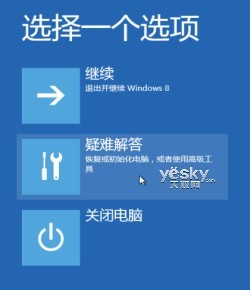 Win8系统机器会自动进入系统选择列表,我们在继续、疑难解答、关闭电脑三个选项中选择“疑难解答”。进入疑难解答选择界面之后,选择“高级选项”。