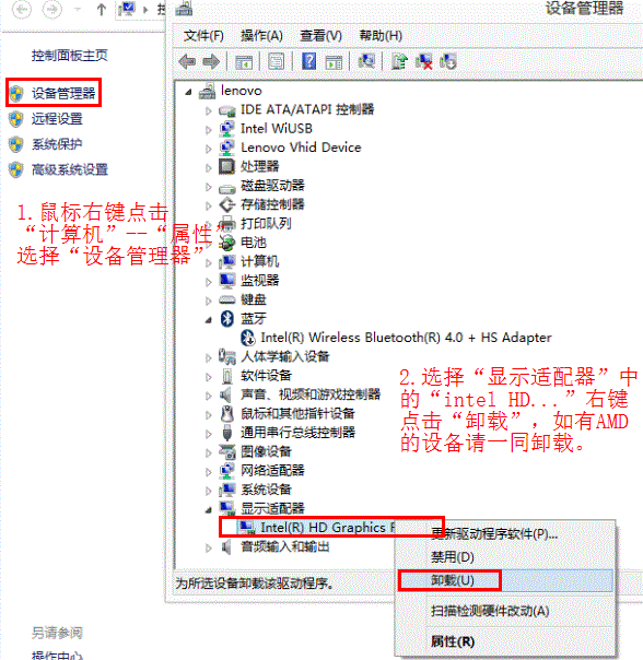 在设备管理器卸载 Intel 和 AMD 的显示卡驱动程序。