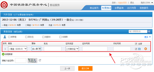 4.填写好搭乘火车的旅客个人信息,包括证件号码、手机号码等,点击提交订单;
