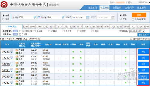 3.选择需要预定的火车班次;