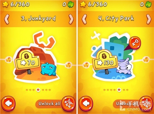此外,在关卡设计方面也有不同,除了每个场景固定的20个关卡外,玩家还可以依靠游戏中收集的四叶草来开启4个额外关卡,而三星的闯关设定还是 一样的,吃到3颗星星就能获得三星。当然如果你在短时间内通关的话还能获得金牌,对于有强迫症的玩家,反复争取三颗星星是不是很有趣?