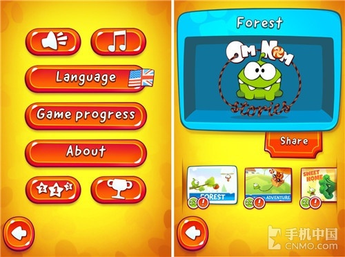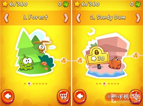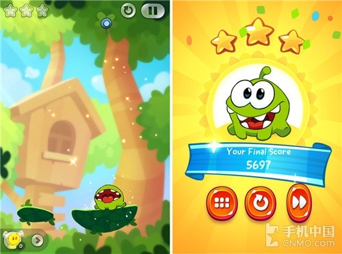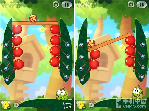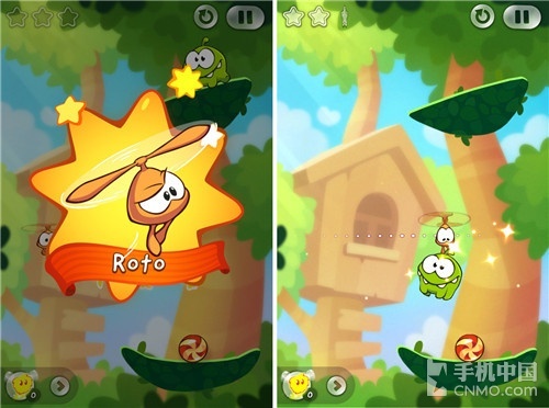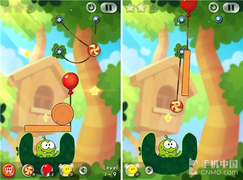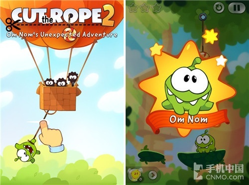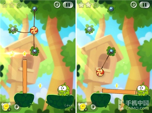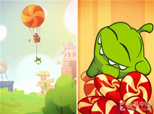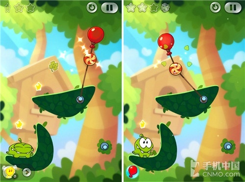 由于有了这些小伙伴以及新元素,所以在《割绳子2》中,Om Nom不再是那只只会无聊的等待糖果下落的小呆了,而是更加活泼可爱,并且有点主动出击的意思。玩家可以让他随意移动,改变他的位置,通过小伙伴的帮忙让获得糖果的过程变得更加欢乐有趣。