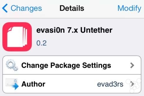 在 Cydia 搜索 evasi0n 7.x Untether 就能找到这一更新包。搜索到后直接安装更新即可,目前这个补丁已经是 0.2 版本。
