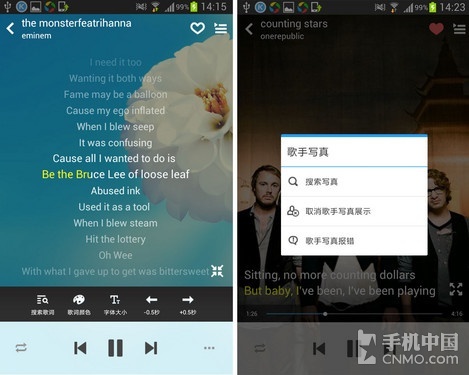搜索界面比较清晰,还可以查看历史搜索记录,唯一想吐槽的是:搜索栏下方的推荐歌手和曲目种类有些太小了,那么大的界面却有许多空白, 这样非常容易误触啊,视觉效果也不是很好。播放界面以歌手照片为背景,自动匹配歌词无需搜索下载,以滚动形式在屏幕上播出,觉得太乱也可以选择只显示两 行,就是歌词字体太小了,小编这样的视力看着还行,要是在摇晃的车厢里恐怕看一会就头晕了吧。