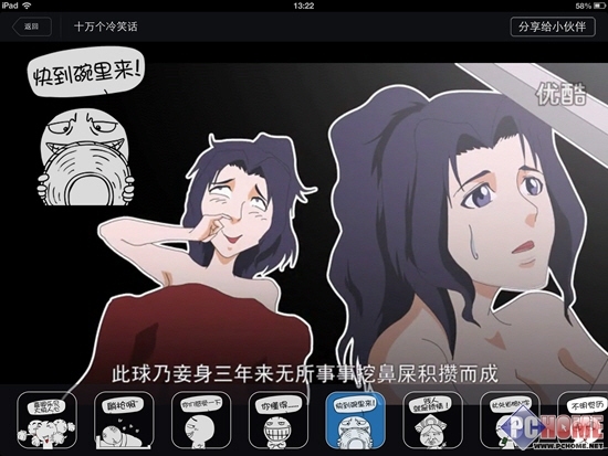 看片时,可在精彩画面稍作停留,为画面插入各种搞笑图片,与新浪微博/腾讯微博/人人/QQ好友一起分享精彩瞬间。