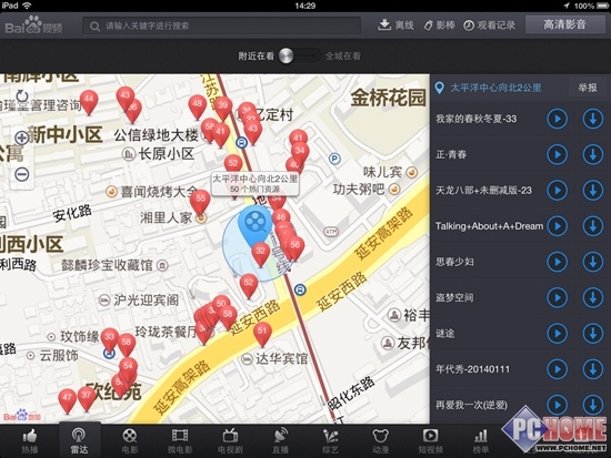 只要在设置中心打开百度视频定位服务,用户就能通过“雷达”瞧一瞧,看看身边的其他用户都在看什么片子。在当前位置2公里内,大家都在看什么呢?