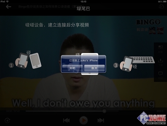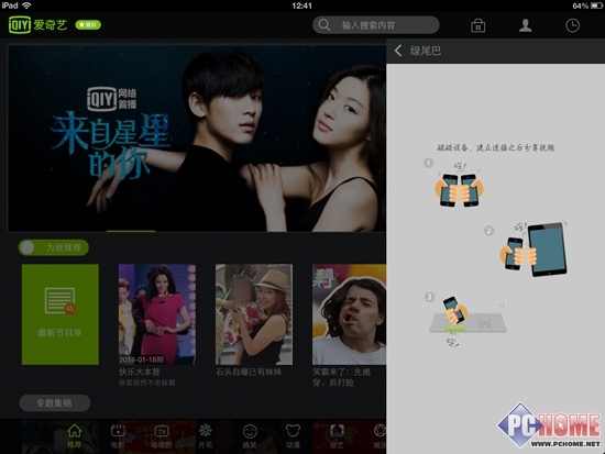 具体操作:一台设备(手机、iPad、电脑)用PPS播放视频时,启动播放器上的绿尾巴,而另一台手机也需要打开绿尾巴来接收即可,成功接收后,就能在手机上继续收看刚才的视频了。(若要接收电脑上的视频,只需手机轻碰键盘空格键。)
