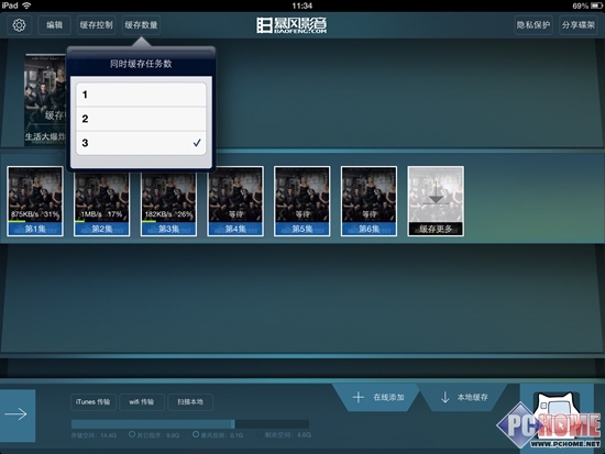 暴风影音:支持欧美剧/电视剧缓存,可同时缓存3部影片。提供隐私保护(6位数字密码保护)。支持iTunes传输与WIFI传输、扫描本地。