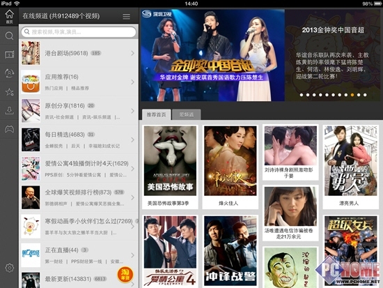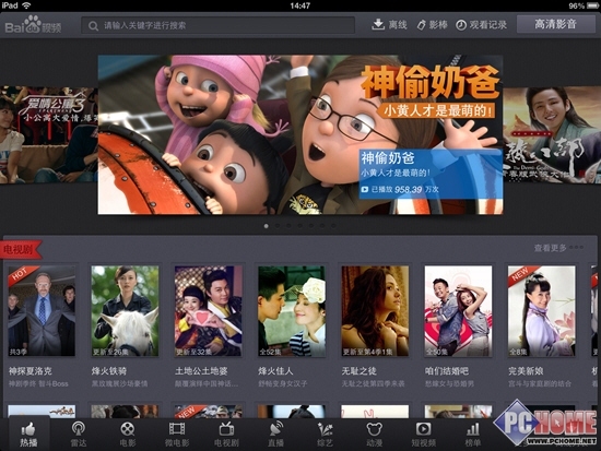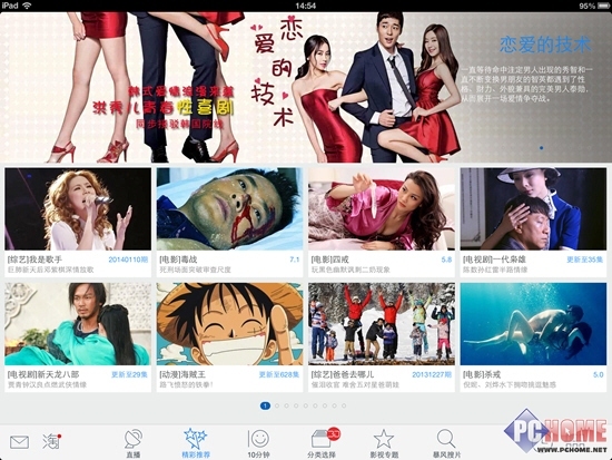PPS主界面以竖向排版,工具栏、视频搜索、精彩推荐。在视觉体验上还是不错的。