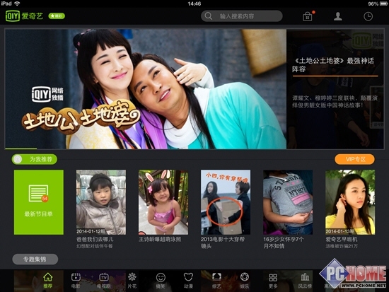 爱奇艺主界面分为3个版块内容:VIP专区、为我推荐、专题集锦。界面布局也算是简洁明了。
