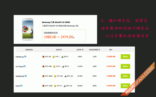 成功完成产品描述后,淘宝会开始自动收集并筛选回购商家的出价情况,并给出一个具体的回收报价区间供用户参考,在报价下方有具体的回收商信息,我们可以参考报价、信誉评价等信息,选择将手机出售给哪家商家。