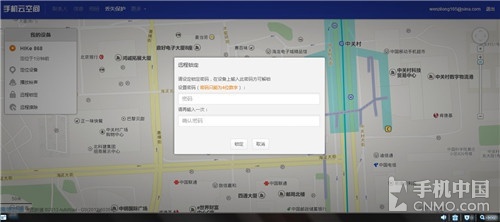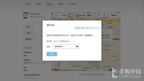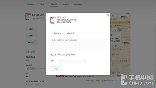 正如上图所示,笔者点击“定位”之后,过不了多久,就能够在PC上看到这台手机的大概位置。这还不算什么,当我们点 击“操作”之后,会看到“锁定手机”以及“播放声音”两个功能。“锁定手机”功能无需过多介绍了,选中之后只要输入正确的Flyme账户的密码就可以实现 远程锁闭当前这台手机了。
