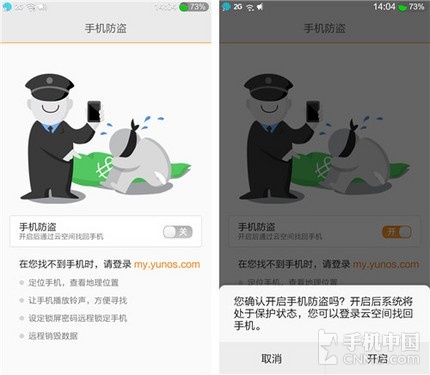 进入菜单之后我们会看到“手机防盗”这四个字,点击后面的按钮打开防盗功能,这时手机会提示我们是否开启防盗功能,我们在这里点击“开启”。