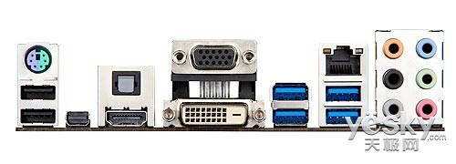 在主板背板上,也是异常丰富,最抢眼的就是四种视频输出端口,VGA+DVI+HDMI+DP,满足最苛刻的用户需求,还有6组USB2.0和2组USB3.0,千兆网络接口和8声道高保真音频输出。