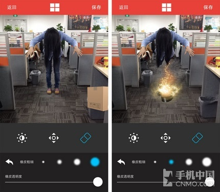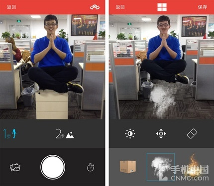咱们再来加点难度试试别的效果。摆脱重力腾空飞行一直是人类的梦想,这次有个软件就能实现了。我们先请模特在小柜子上做好,拍摄完第一张照片之 后再单独拍摄一张背景,注意手不要晃动尽量保持两张照片重合。接着小编选择了右下角的橡皮擦功能,小心的沿着柜子的边缘涂抹使柜子隐形,接着再使用魔法隐 形中的烟雾效果。怎么样,在一团仙气的衬托之下,小编的同事终于可以在空中自由翱翔了。