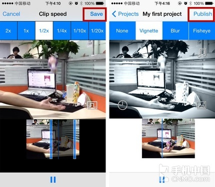 点击一下视频,会出现两条蓝色的粗线将视频分割出时间段,您想让哪里时间停顿就将区域移动到哪里。停顿的时间也是可选的,最慢可达1/20X, 保证能满足您的需求。编辑完成一定要点击右上角的“Save”字样,否则是无法添加放慢效果的。预览后再点击右上角的“Publish”字样。除此之外还 有滤镜效果,复古、艳丽、鱼眼随您自由添加。