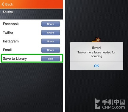 如此有趣的照片当然要好好保存,点击右上角的“Share”并选择“Save to Library”就大功告成了。需要注意的是,软件只能对两张脸进行互换,所以照片中只能有两个人,请各位选好背景并将脸摆正,否则软件是找不到您的脸的。