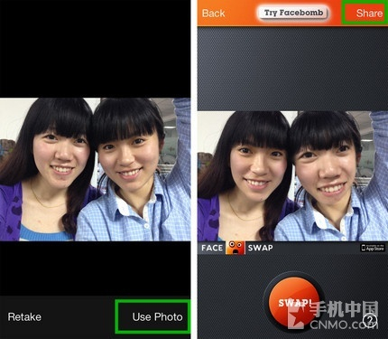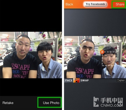下图左侧是没有添加任何效果的原图(好像已经有什么奇怪的东西混进去了),在点击右下角的“Use Photo”字样后,请您将口中的食物咽下,牢牢握紧手机,并且在椅子上坐稳准备开始大笑。换脸的过程是自动进行的,您可以手动调整面部的大小及位置。