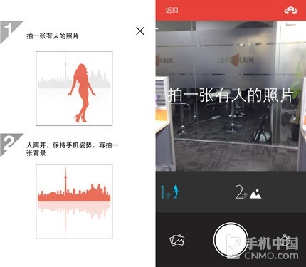 我们来看看它有啥本领。第一次使用之前软件会显示使用方法,小编觉得这点很赞,掌握了使用方法才能更好的运用。第一步需要拍一张有人的照片,第二步保持手机不动而被拍摄人离开画面,这样是为了让两张照片更好地融合在一起,两张都拍摄完毕后自动进入修改界面。
