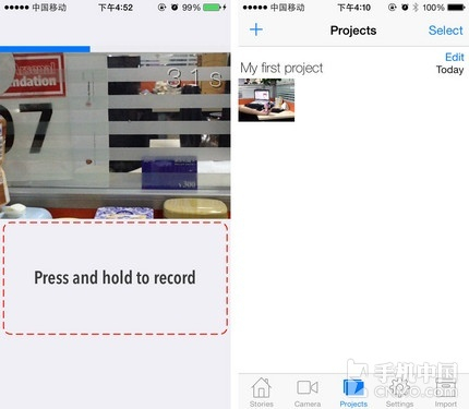 按住屏幕中的白色方框,拍摄完毕之后再松开手,右上角会显示您所拍摄的时间,方便您掌握。拍完之后自动转到视频列表,选中您拍摄好的视频片段再点击右上角的“Edit”字样,或者直接点击视频就可以编辑了。