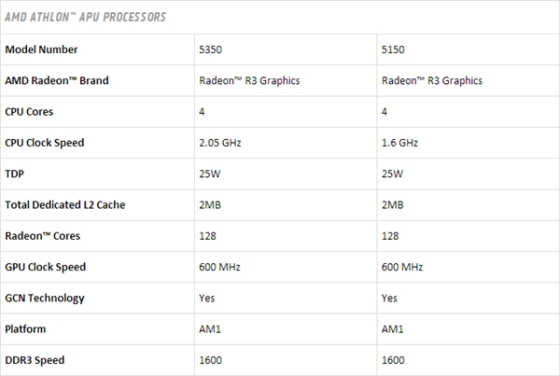 新速龙有Athlon 5350、Athlon 5150两款型号,都是美洲虎架构的四核心、2MB三级缓存,主频2.05/1.6GHz,GCN架构的图形核心简单地命名为Radeon R3(Kaveri APU里边是Radeon R5),128个流处理器,600MHz频率,支持DX11.2、OpenGL 4.3,内存支持单通道DDR3-1600,热设计功耗25W。