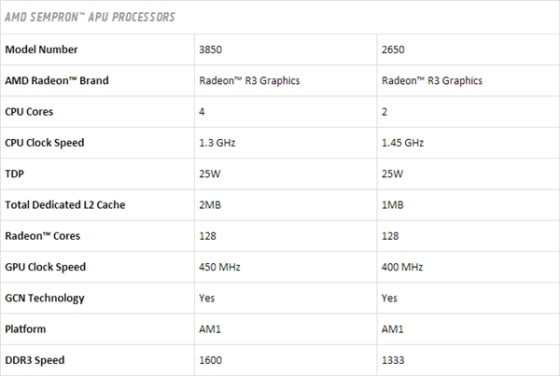 新闪龙则有Sempron 3850、Sempron 2650,分别是四核心2MB三级缓存、双核心1MB三级缓存,主频1.3/1.45GHz,图形核心也叫Radeon R3,128个流处理器,450/400MHz频率,内存支持单通道DDR3-1600/1333,热设计功耗也是25W。