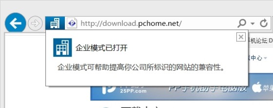 4、启动IE11,进入希望用企业模式访问的网页,按下alt键激活主菜单栏,接着点击工具——企业模式,待网页重新加载后会看到地址栏左侧多出一个蓝色标志,点击会显示企业模式已打开。