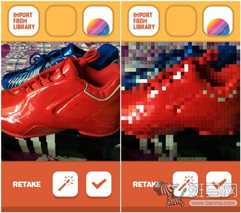莫名觉得这款应用很有喜感,咳咳,先言归正传,在开打软件后,先挑选一张照片,当然也可以直接拍摄一张,选好后点击魔棒,就会变成由乐高方块图案组成的像素照片。