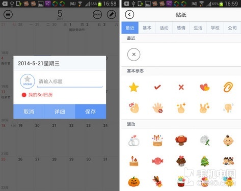 长按日期即可添加日程,而它最大的不同点也在于此,在输入了内容之后还可以添加上可爱的小标签,从感情到生活,从学校到公司应有尽有,几乎包含了各种活动类型,添加完毕之后界面立刻平添了一种萌萌的温馨之感。